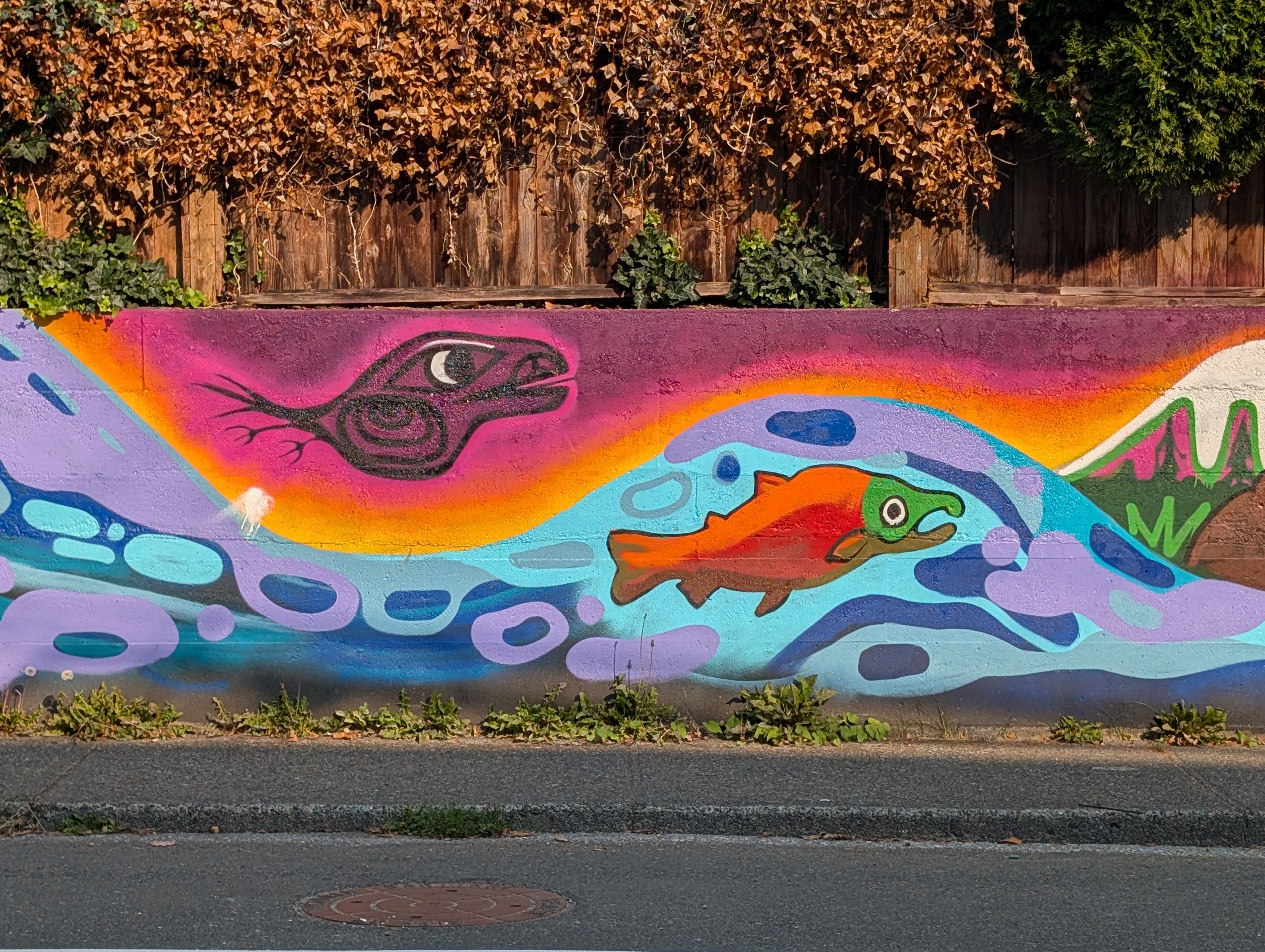 For my section of the mural, I asked the homeowner what kind of animals he wanted to see. He expressed a desire for salmon swimming next to his house, which was serendipitous since my people are traditionally salmon caretakers. I aimed to depict the river that flows through the mountains connecting my territory to my current home in Victoria. My design included grizzly bears, a sea turtle, and salmon eggs, each symbolizing their natural medicine for the street.